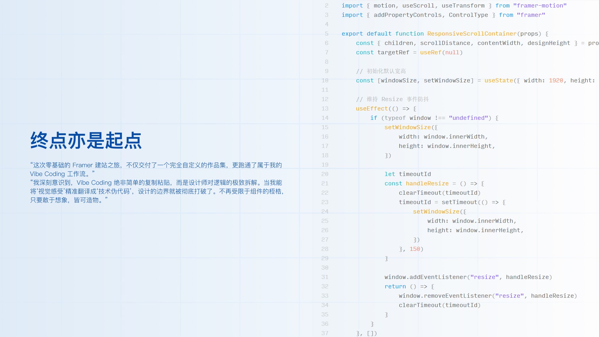 “跳出传统交互设计师的 Figma 画布,我决定零基础从头学习 Framer,并引入 AI 作为结对编程的伙伴(Vibe Coding)。不妥协于现成组件,用代码还原脑海中100%的交互直觉。”