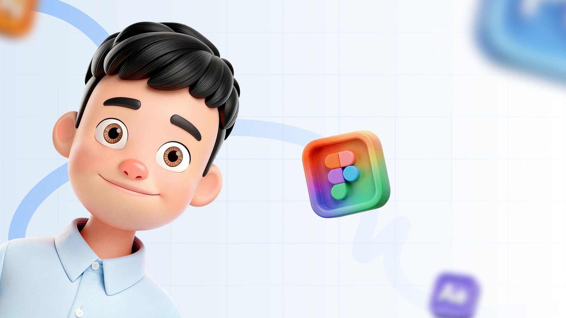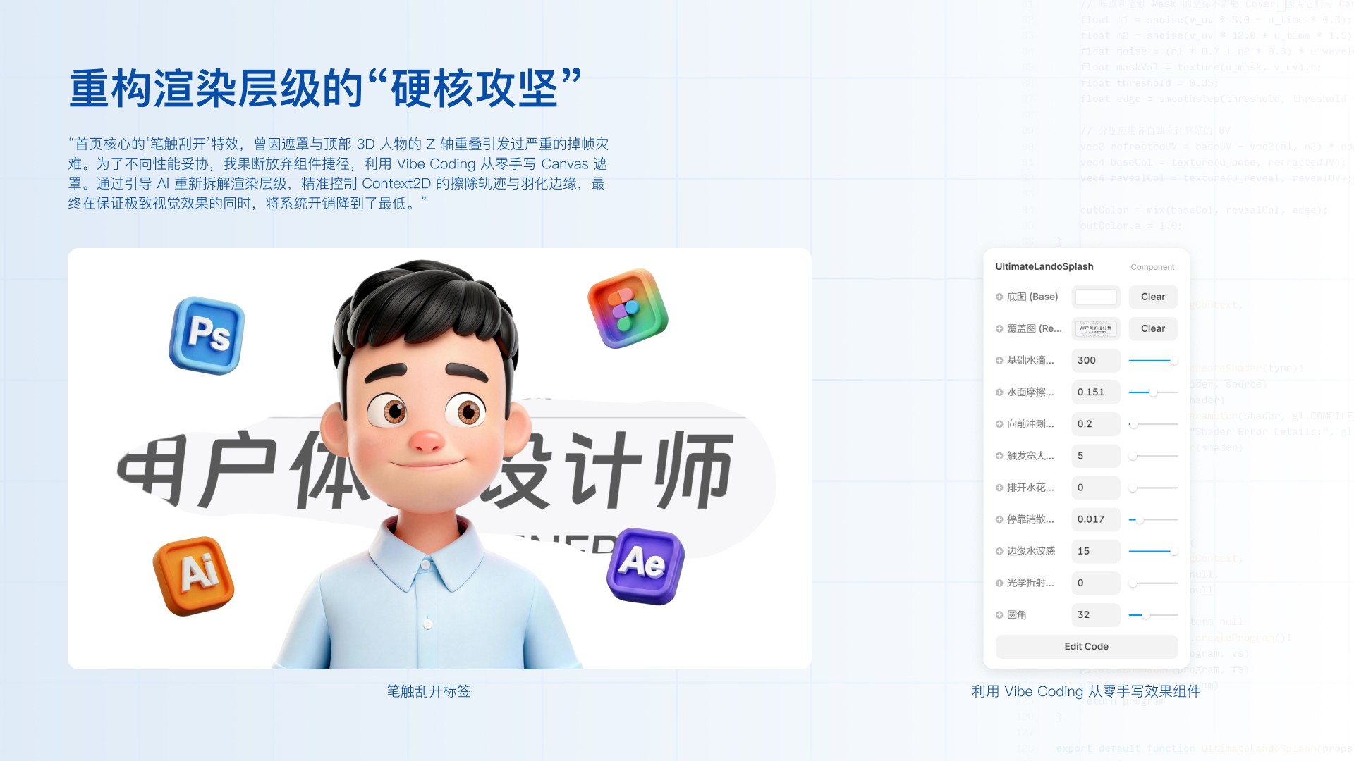 “不再局限于单向的展示,我为 3D 形象设计了四种设计相关软件的趣味状态。利用 Framer 强大的原生动效引擎,精细打磨状态流转间的缓动曲线,将视觉特效转化为极其丝滑的真实网页互动。